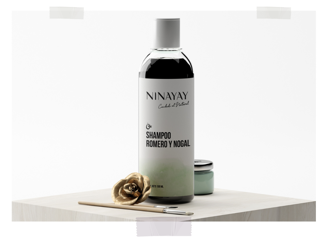 Modo de uso: Aplicar el Shampoo de Romero y Nogal Ninayay, dando un suave masaje con las yemas de los dedos. Deje reposar unos minutos y enjuague.